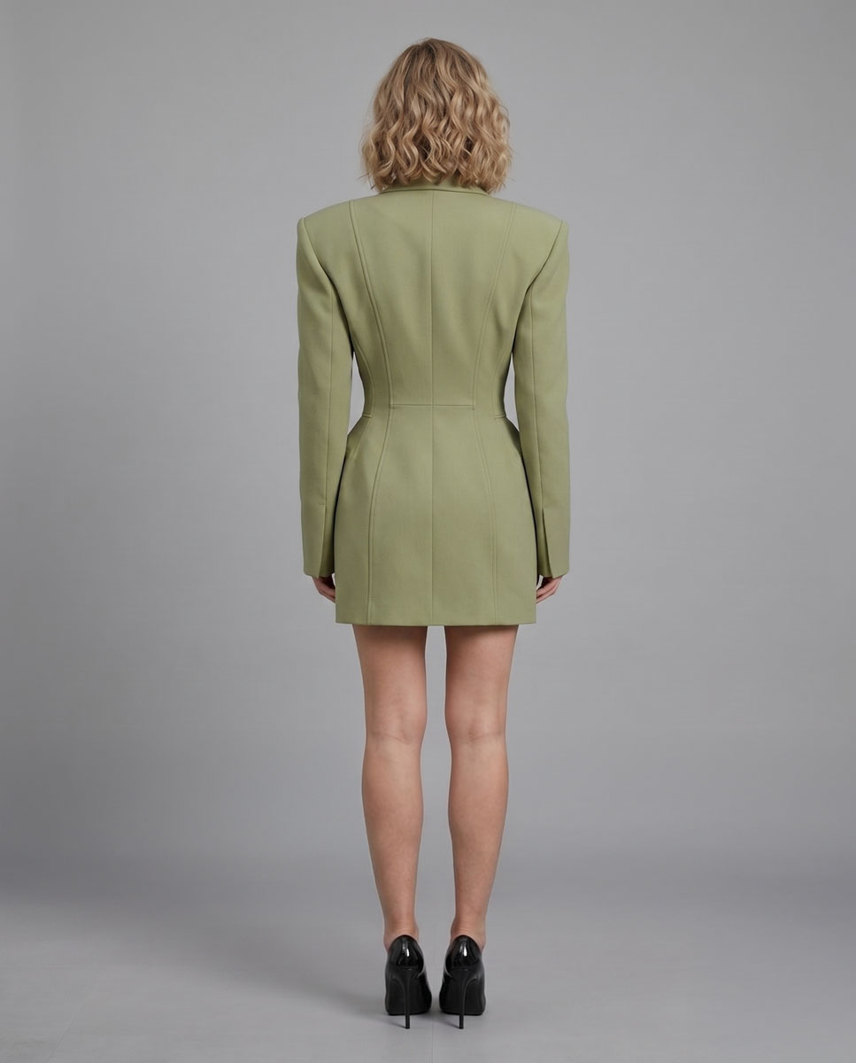 Marynarko-Sukienka Emo Khaki to stylowa propozycja w eleganckim wydaniu. Łączy klasykę marynarki z kobiecym krojem sukienki. Przyciąga uwagę nowoczesnym fasonem.