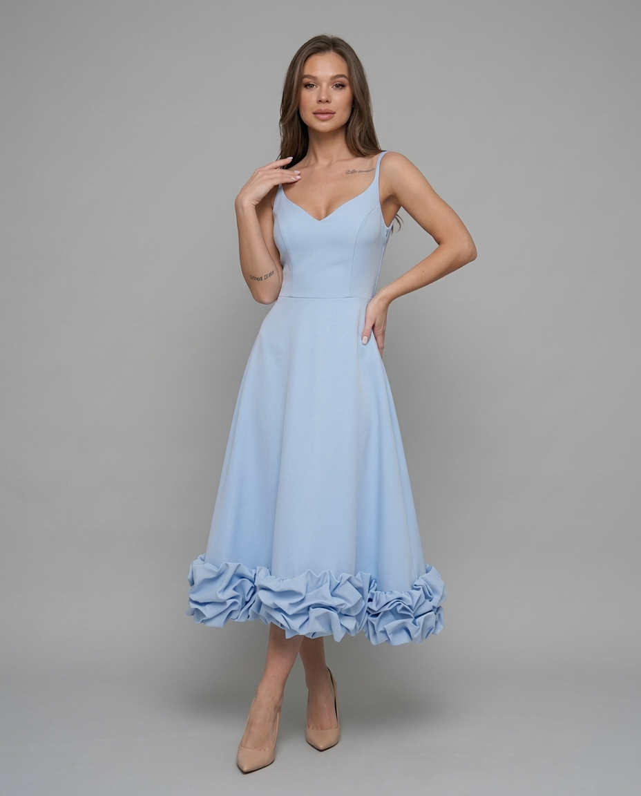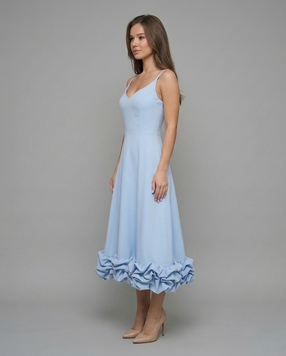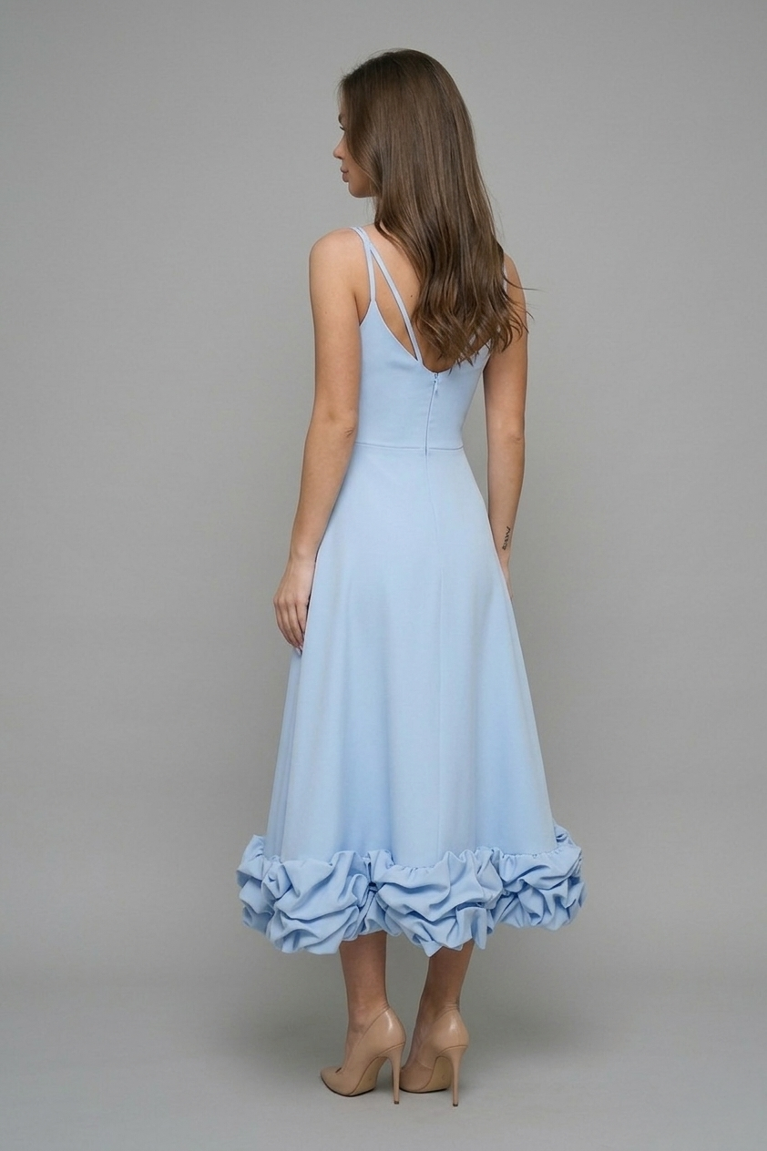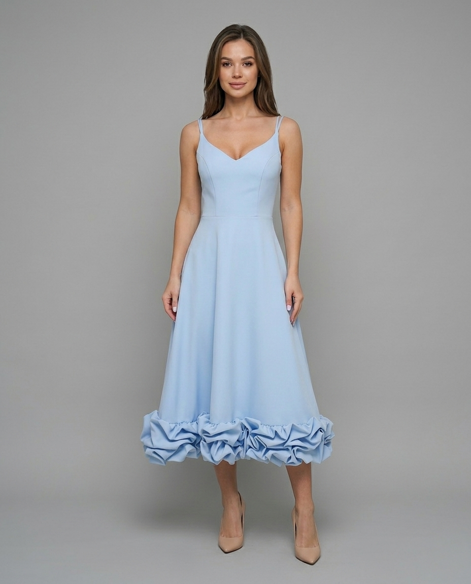 Sukienka Aisza Midi Niebieska to idealna propozycja dla kobiet, które cenią sobie klasykę z nutą romantyzmu. Model wyróżnia się dopasowaną górą na cienkich ramiączkach oraz efektownym, rozkloszowanym dołem zakończonym ozdobną falbaną.