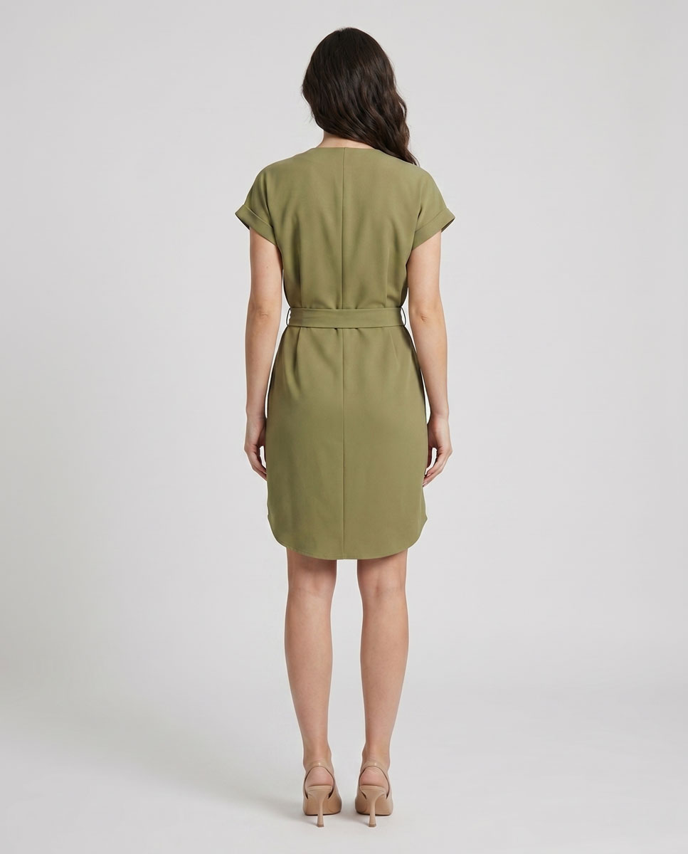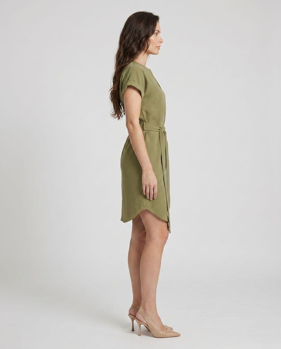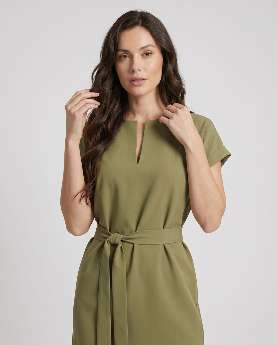 Model o długości przed kolano z krótkim rękawem zapewnia komfort noszenia przez cały dzień. Subtelny dekolt z delikatnym rozcięciem dodaje elegancji i optycznie wydłuża szyję. Sukienka nie posiada zamka – jest zakładana przez głowę, co czyni ją niezwykle praktyczną i wygodną. W talii znajduje się pasek do wiązania, który podkreśla sylwetkę i pozwala dopasować fason do figury.