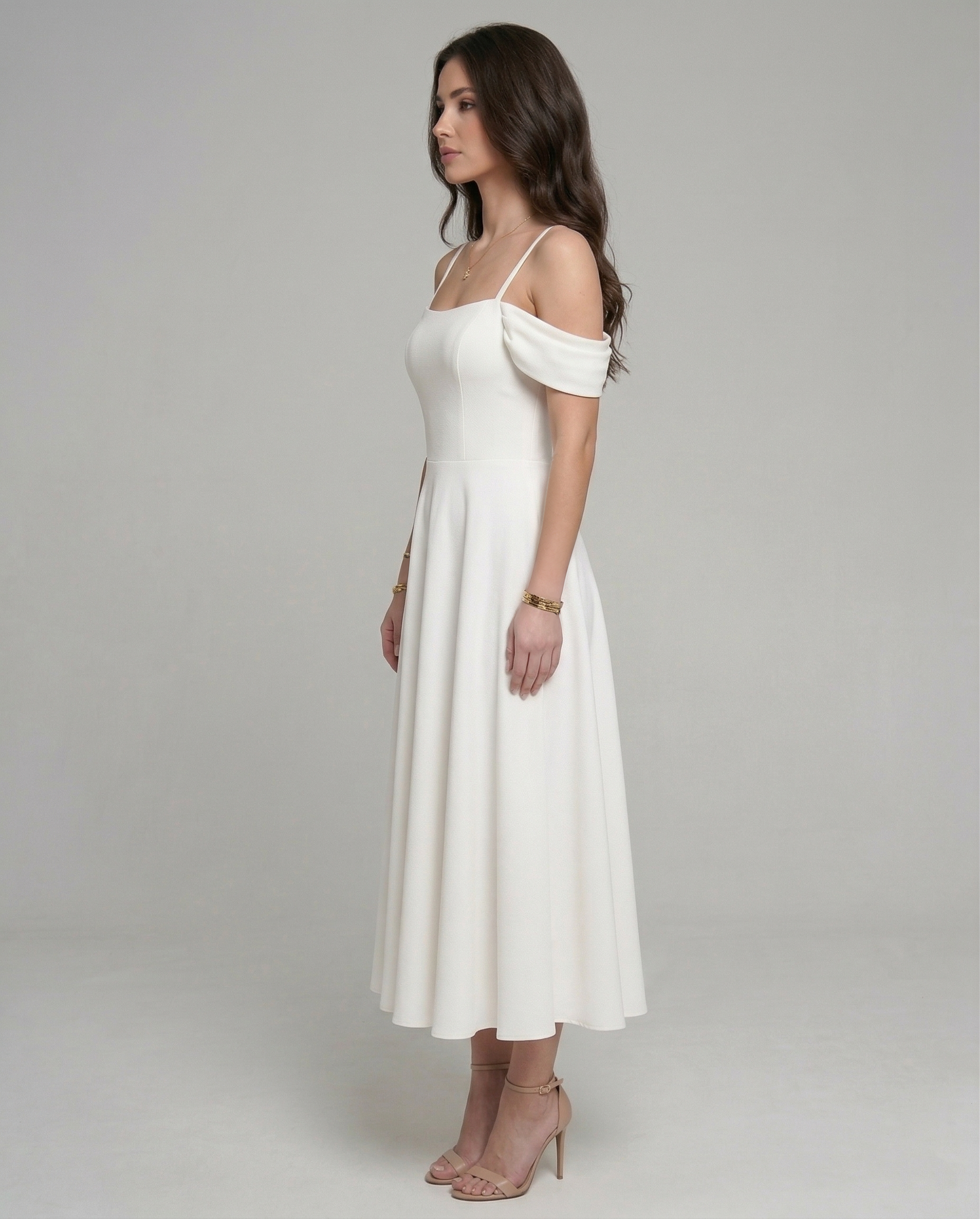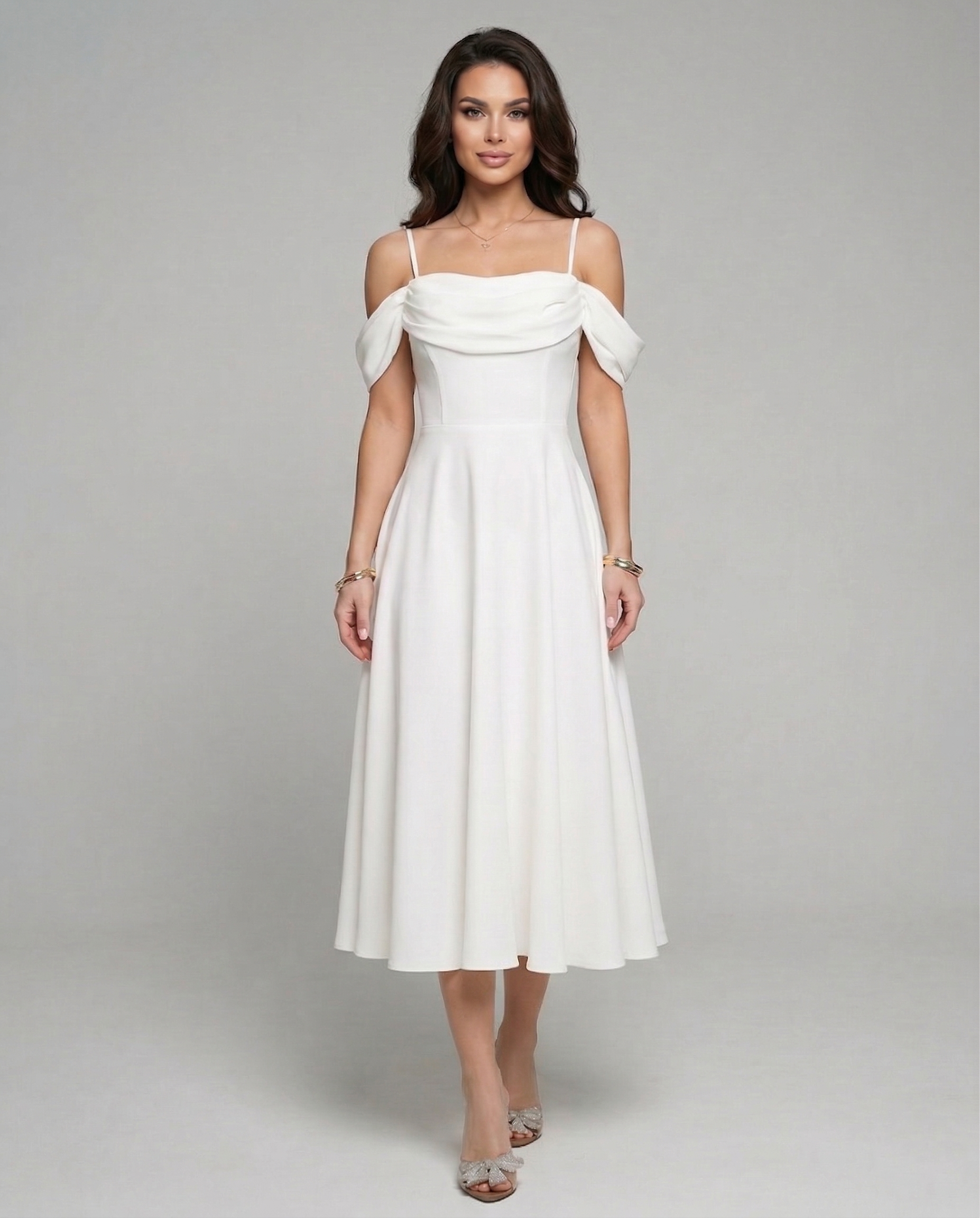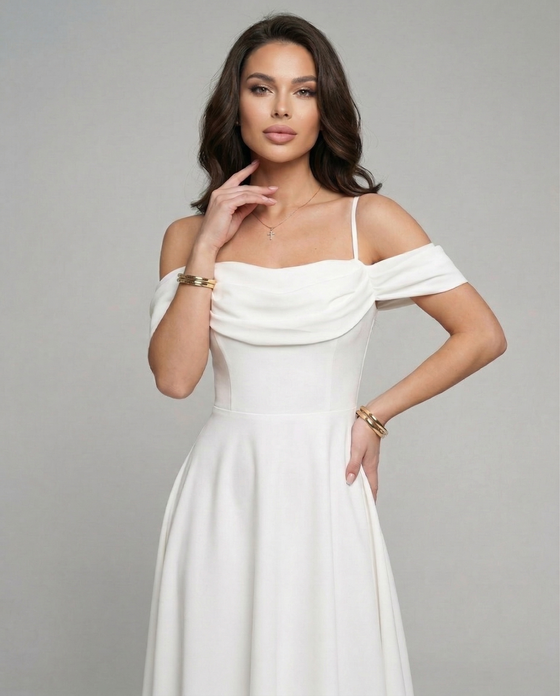 Sukienka Eli Midi Biała zachwyca swoją lekkością i subtelnym urokiem, tworząc idealną bazę do eleganckich stylizacji. To model, który łączy ponadczasowy krój z romantycznymi detalami.