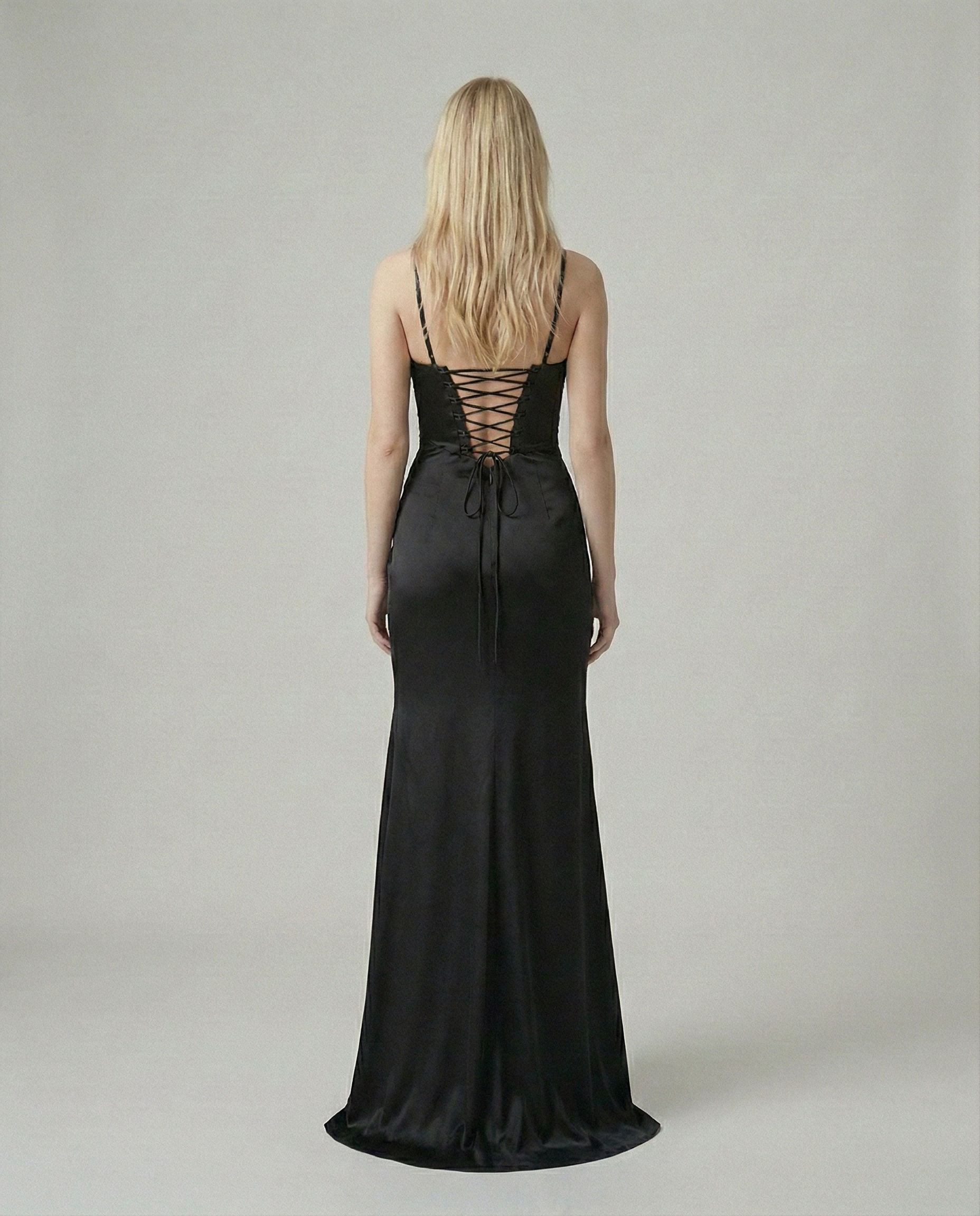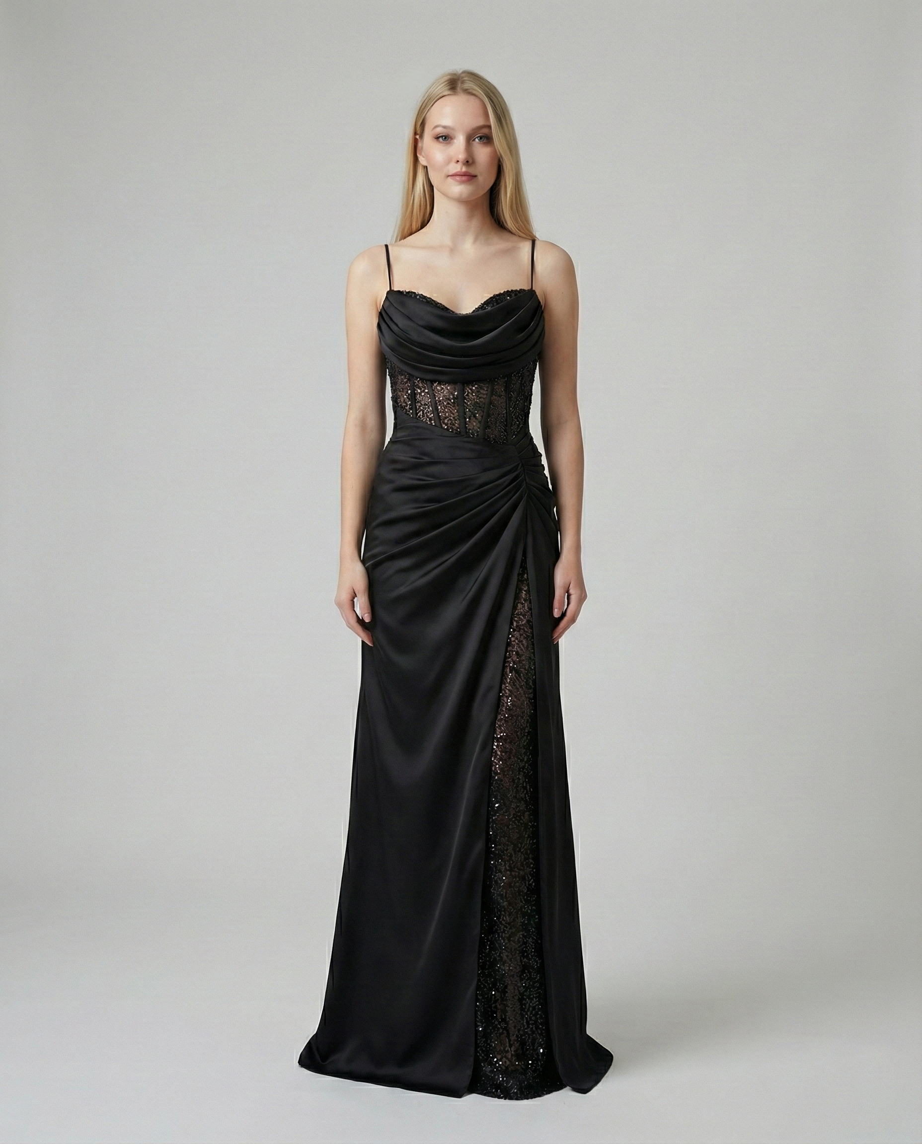 Sukienka Eliza Cekiny Czarna to elegancka sukienka maxi z gorsetową górą i efektownym rozporkiem. Idealna na bal, galę i inne wyjątkowe okazje.