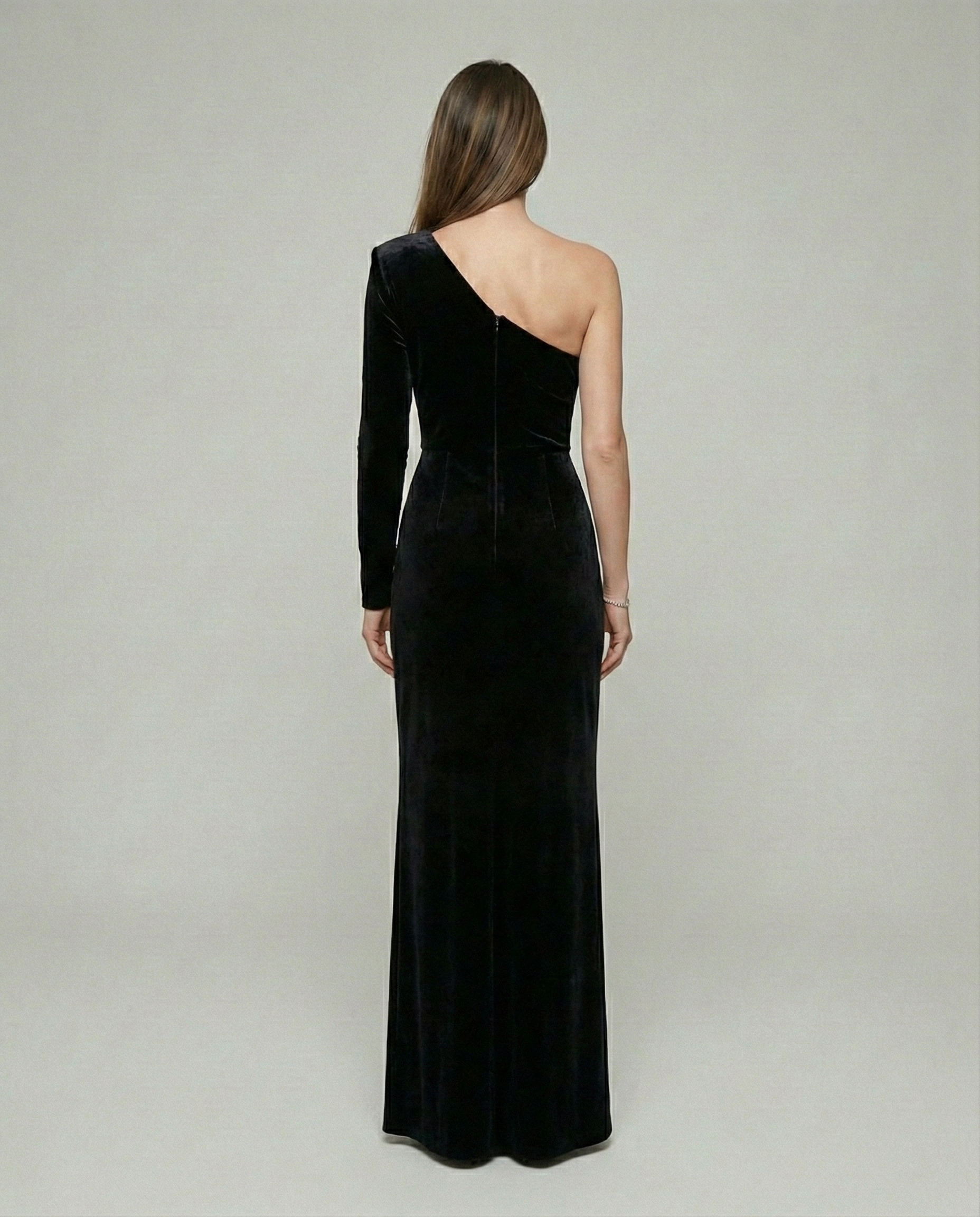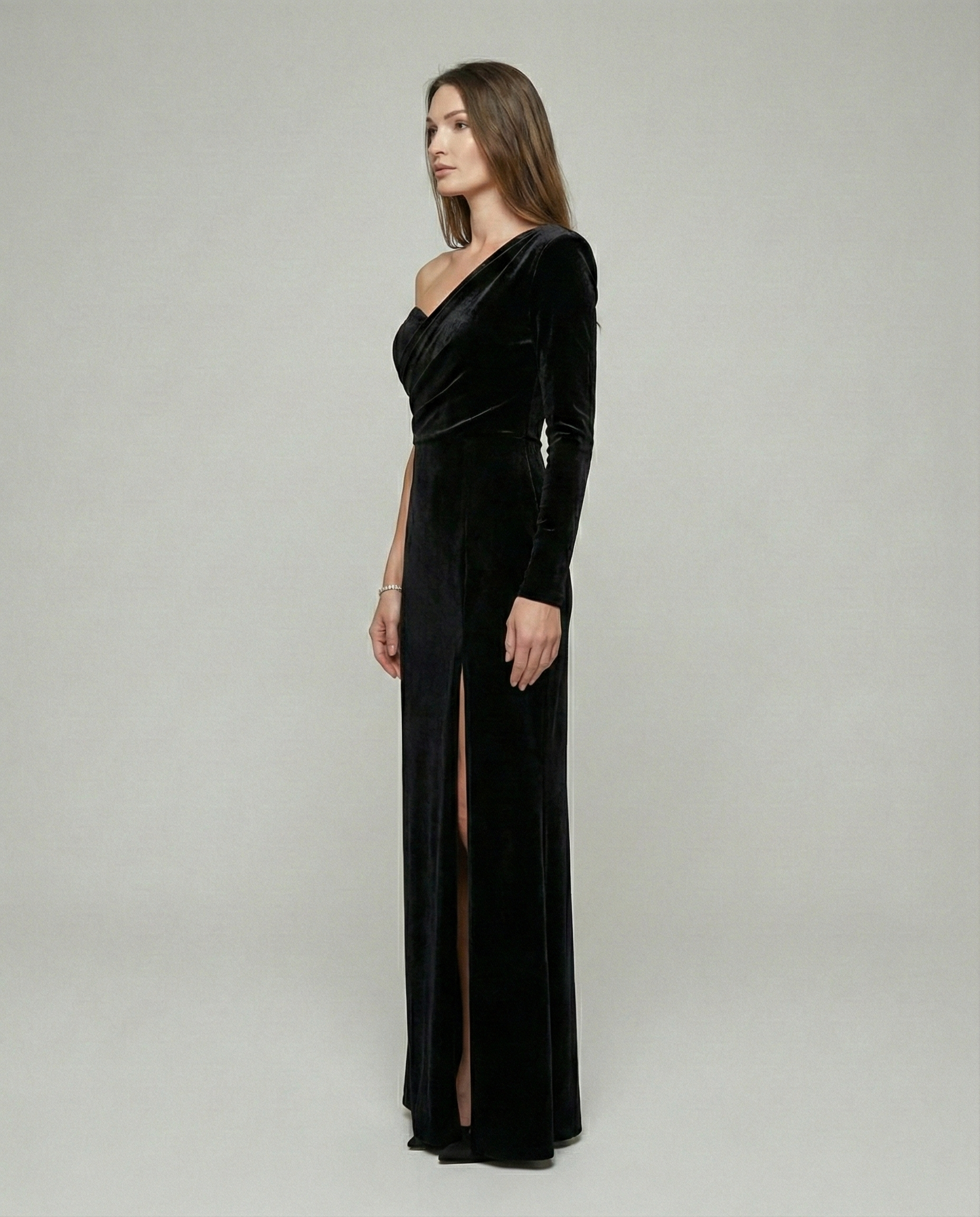 Sukienka Eva Odis czarna to kwintesencja elegancji i ponadczasowego stylu. Długa suknia wieczorowa o asymetrycznym kroju z jednym długim rękawem przyciąga uwagę i pięknie eksponuje ramiona.