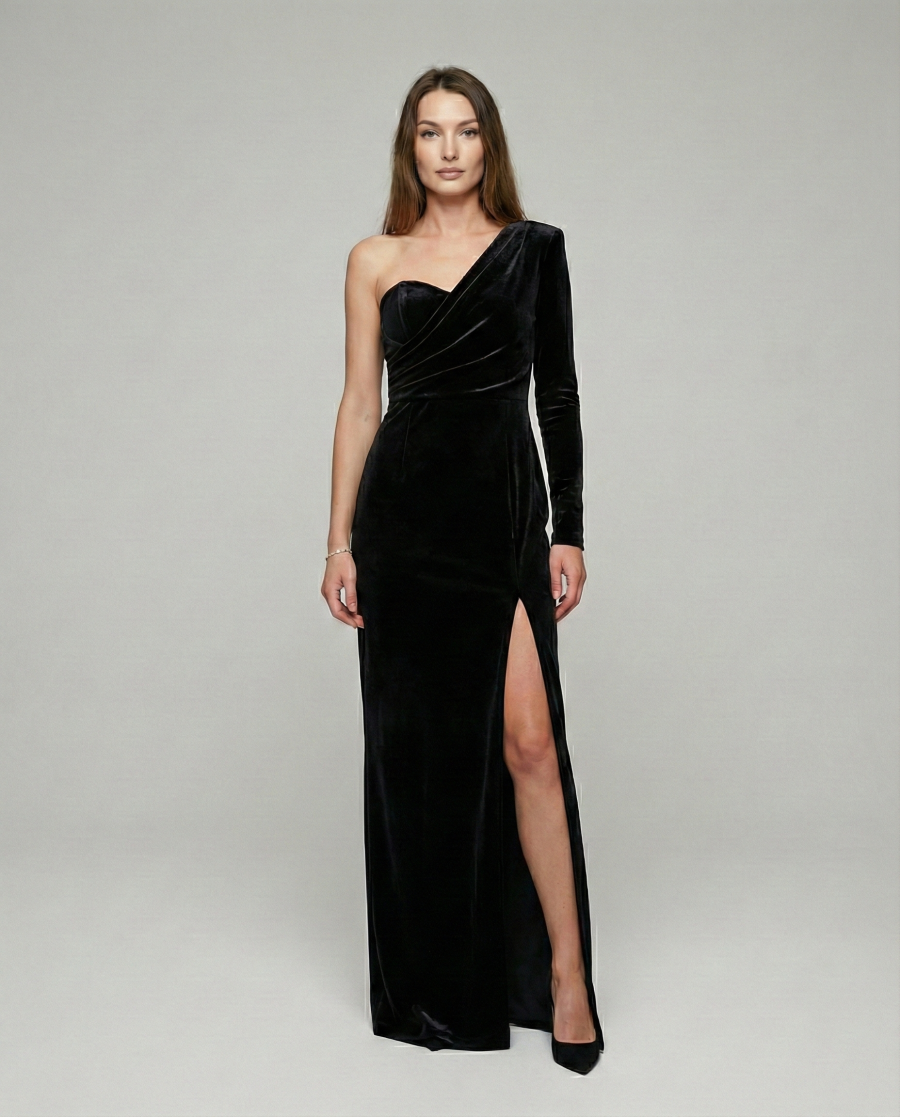 Sukienka Eva Odis Czarna to elegancka, długa suknia wieczorowa z jednym rękawem. Idealna na bankiet, bal, studniówkę i wyjątkowe okazje.