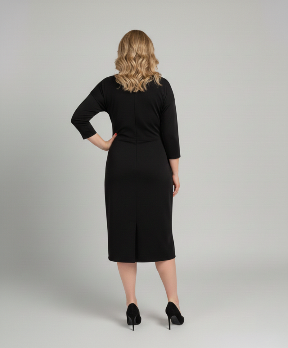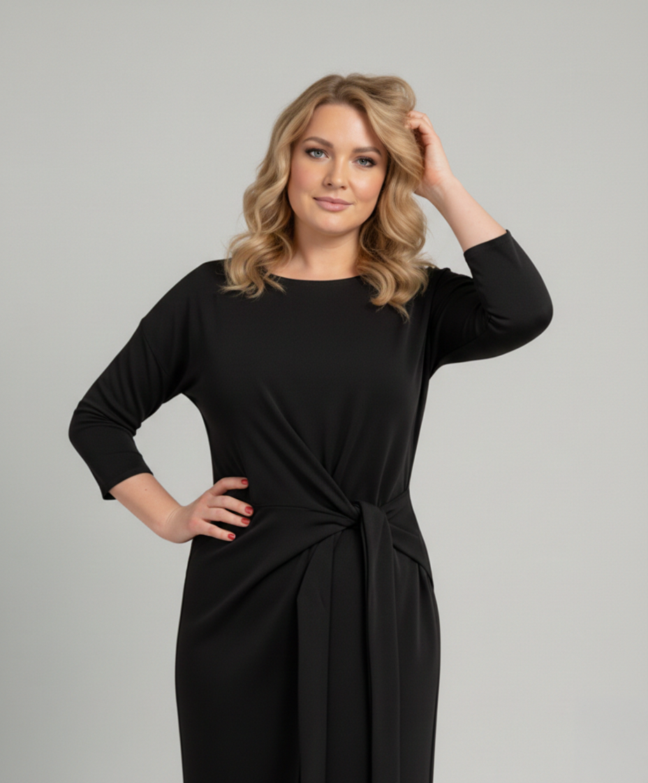 Czarna sukienka posiada rękaw 3/4 oraz efektowne wiązanie z boku, które modeluje talię i maskuje niedoskonałości w okolicy brzucha. Ozdobny rozporek z przodu dodaje lekkości i kobiecego charakteru, a podszewka zapewnia komfort noszenia przez cały dzień i wieczór.