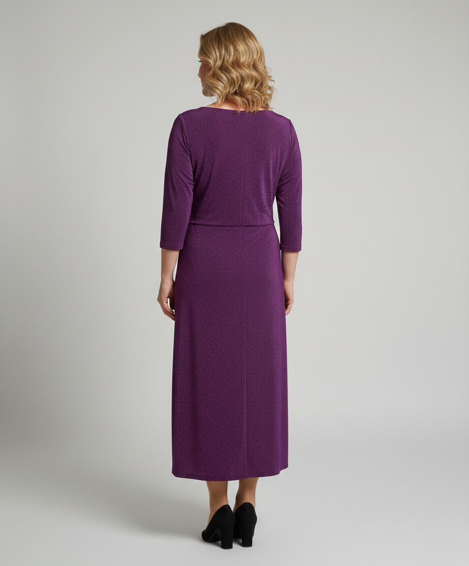 Sukienka posiada rękaw 3/4, który zapewnia wygodę i uniwersalny wygląd przez cały rok. Połyskujący, metaliczny i lekko elastyczny materiał idealnie dopasowuje się do ciała i gwarantuje komfort noszenia. Zamek z tyłu ułatwia zakładanie oraz podkreśla estetyczne wykończenie.
