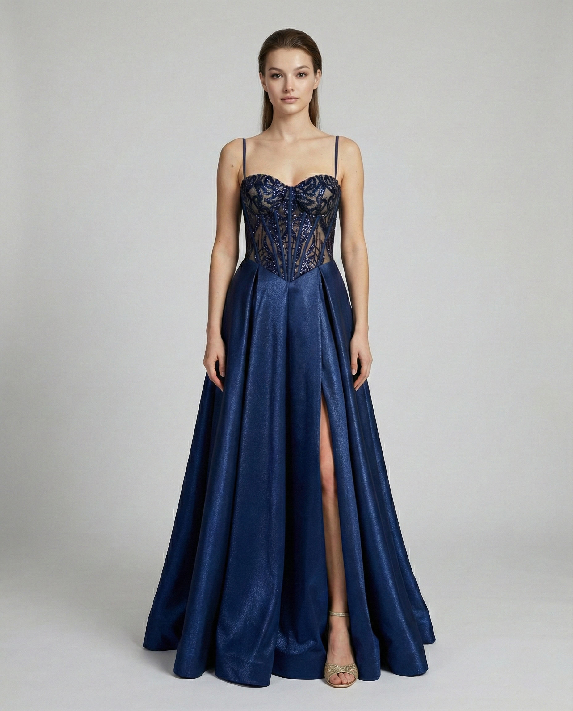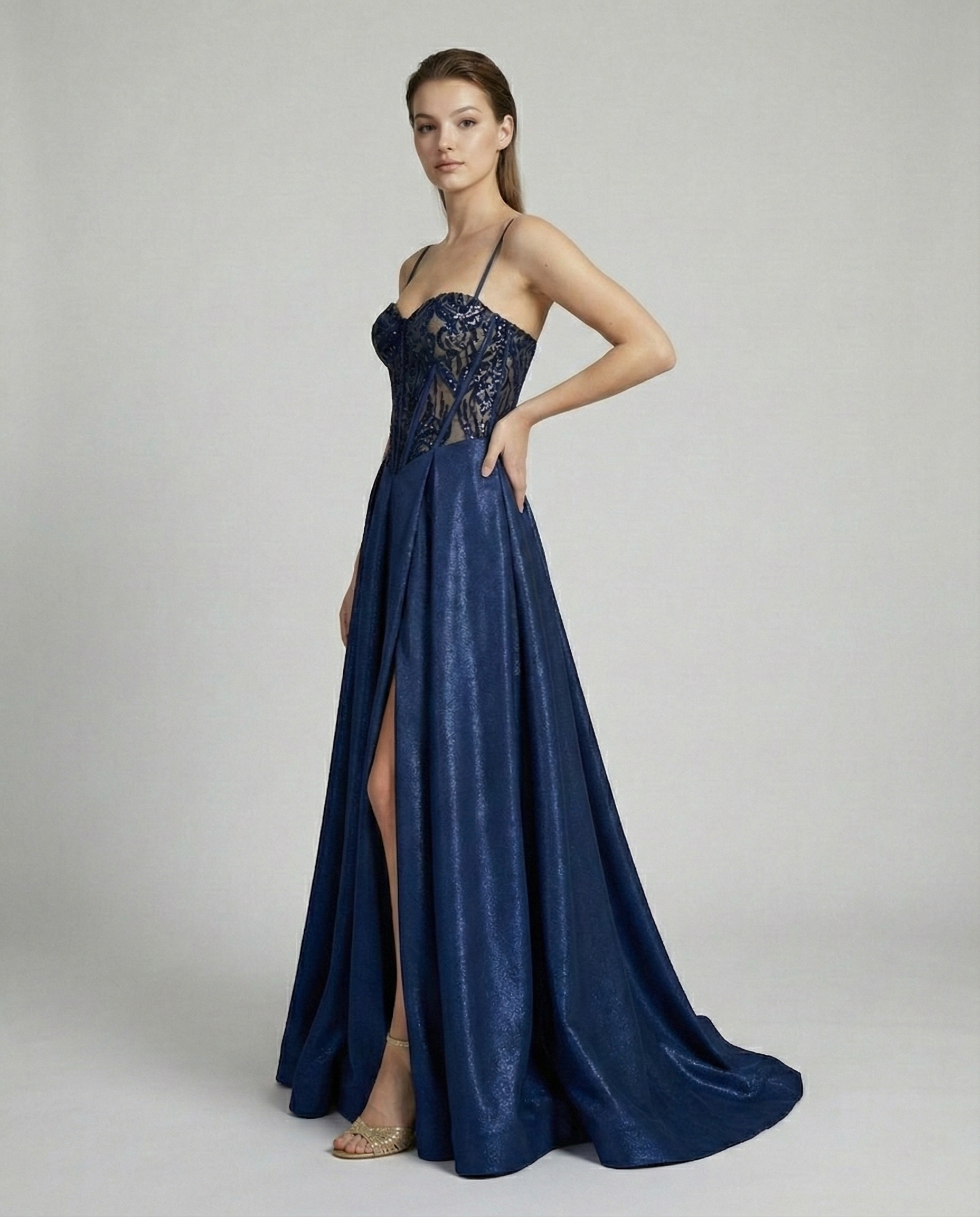Dopasowany gorset zdobiony cekinami pięknie podkreśla talię i biust, modelując sylwetkę oraz nadając jej idealnych proporcji. Połyskujący materiał tworzy efekt luksusowej sukienki wieczorowej, która przyciąga spojrzenia i wyróżnia się na tle innych kreacji.