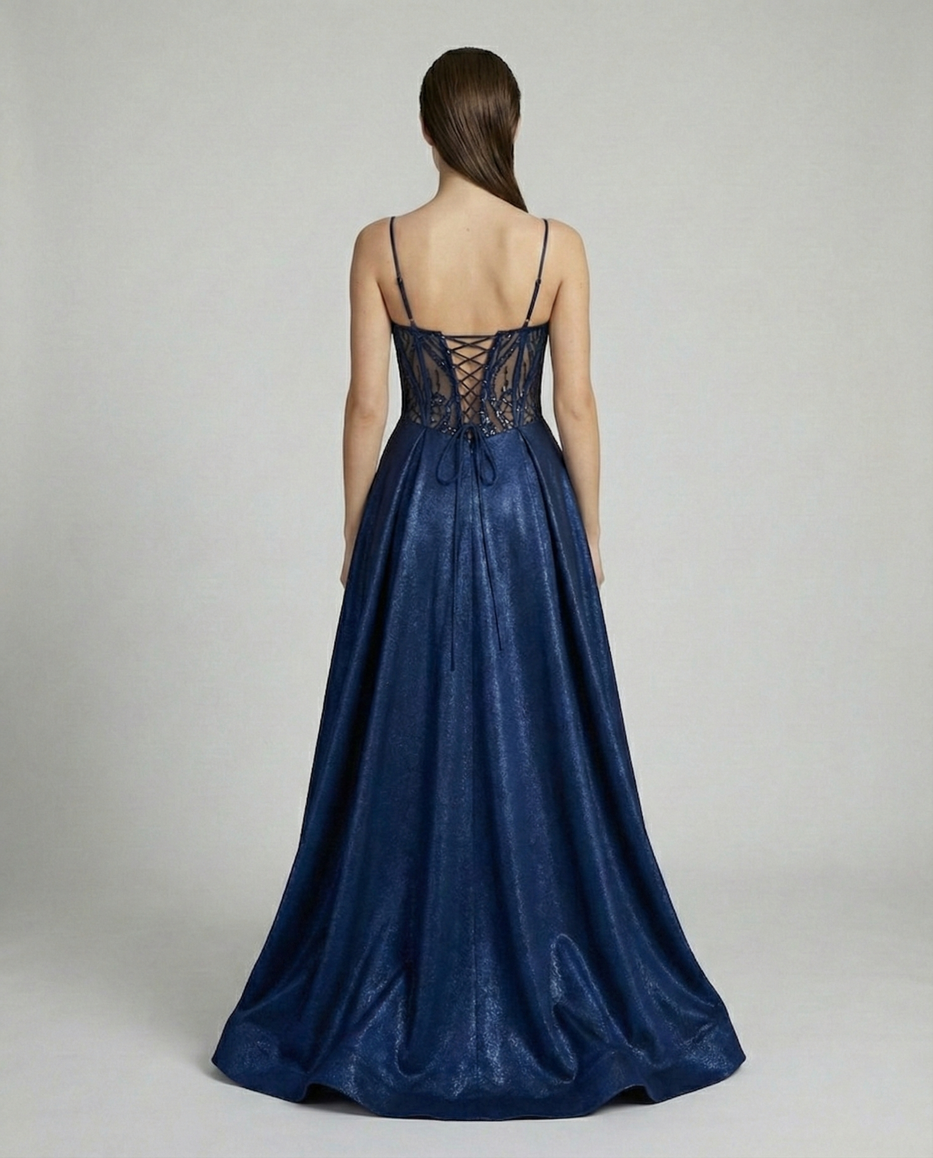 Tył wiązany na efektowne sznurowanie nie tylko stabilizuje konstrukcję gorsetu, ale również subtelnie eksponuje plecy, podkreślając kobiecy charakter stylizacji.