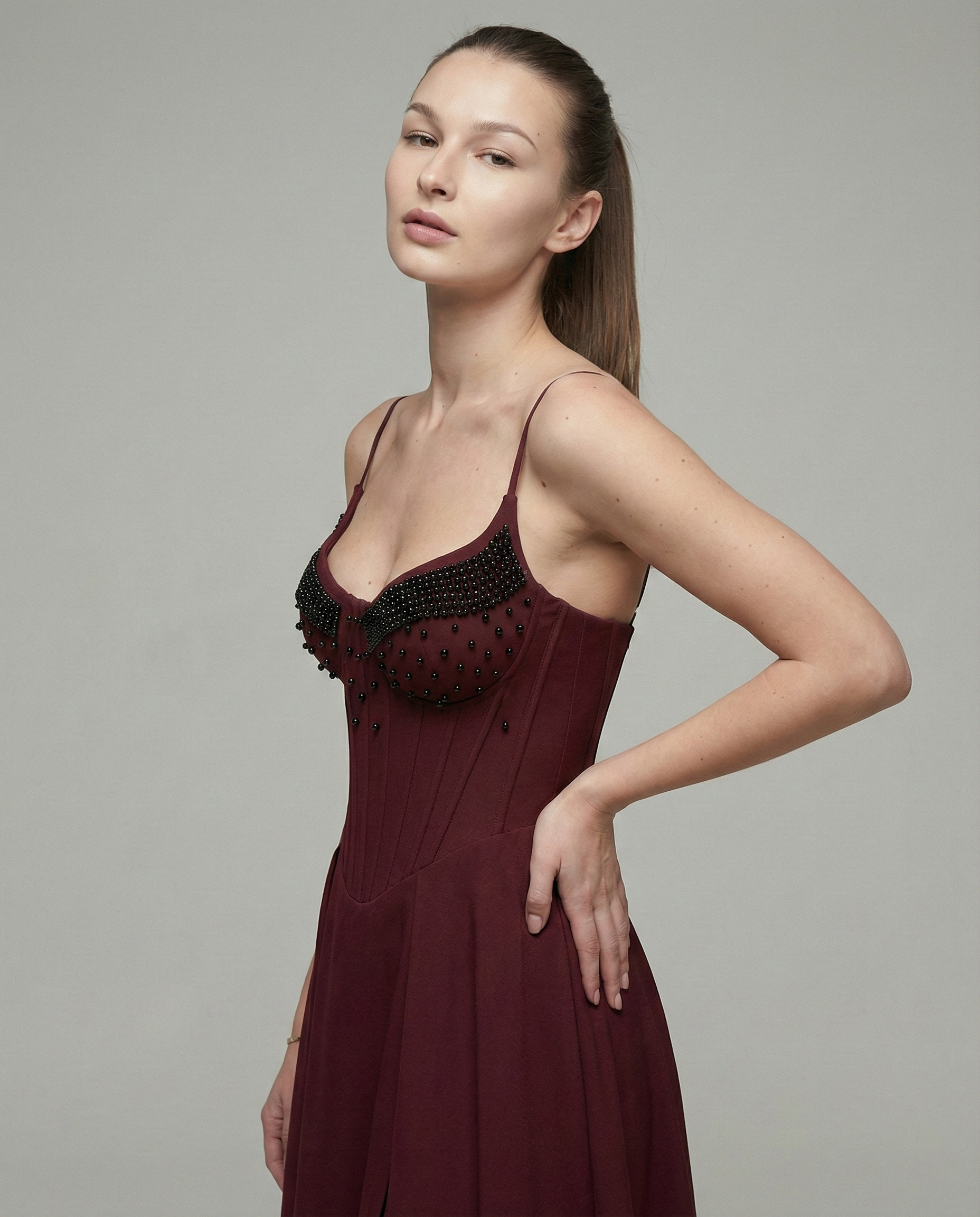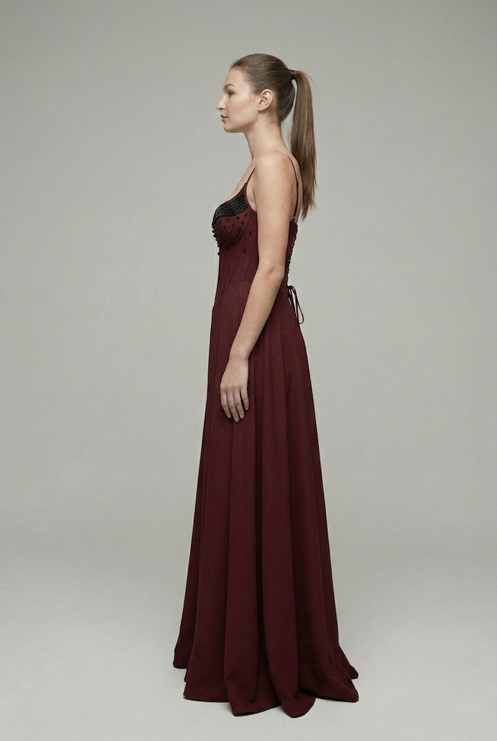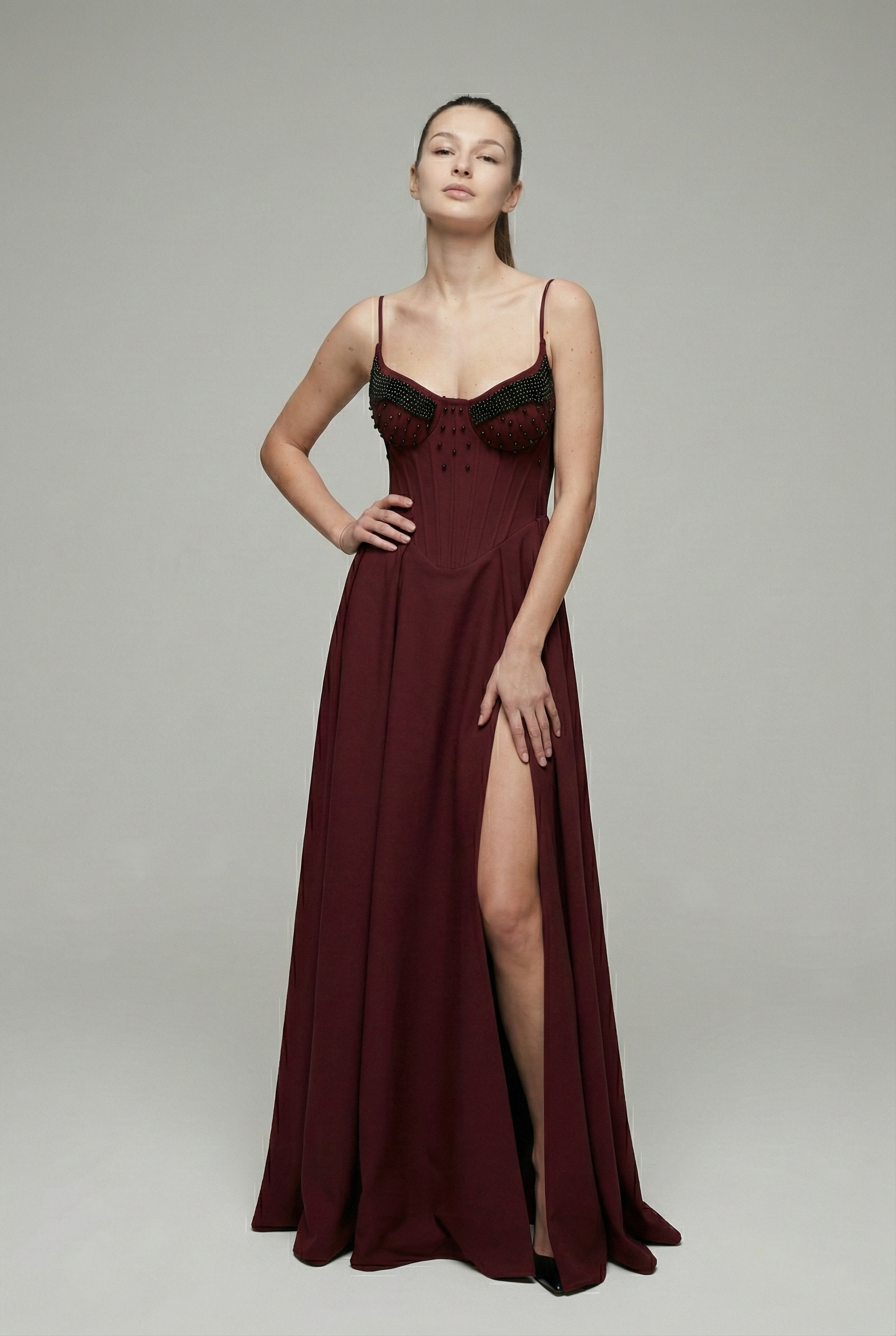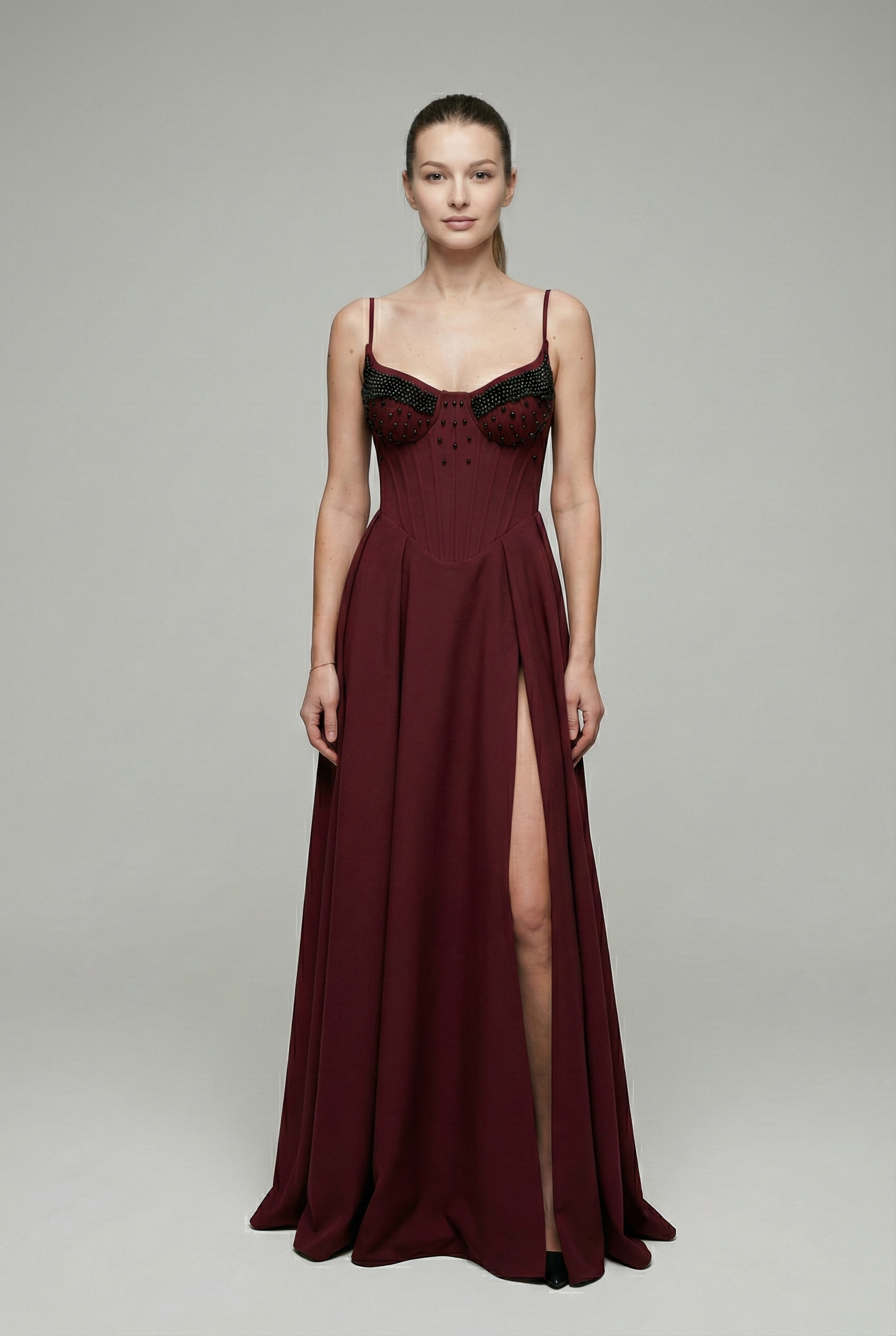 Sukienka Maxi perełki bordowa z gorsetem zdobionym perełkami. Model na regulowanych ramiączkach, wiązany z tyłu, z efektownym rozcięciem na nodze.