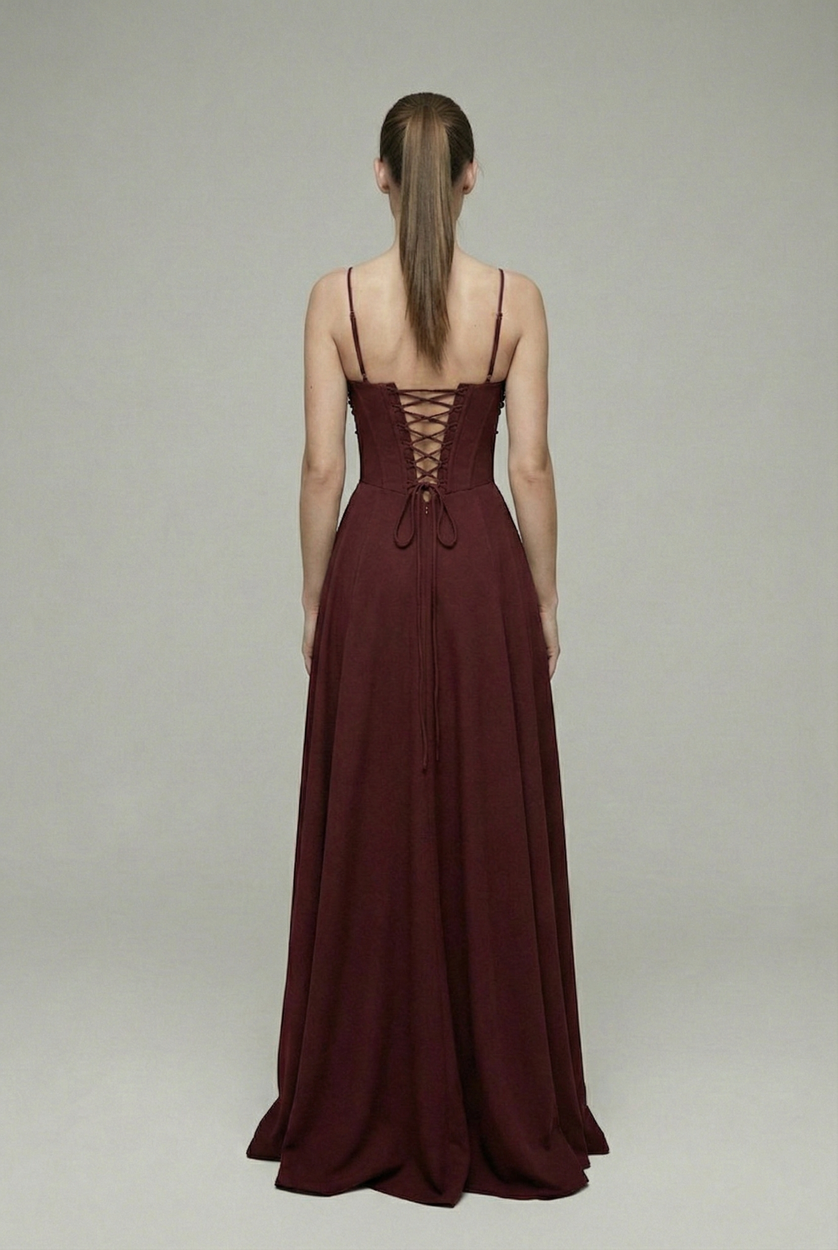 Sukienka maxi bordowa posiada cienkie, regulowane ramiączka oraz wiązanie z tyłu, dzięki czemu łatwo dopasować ją do i zapewnić sobie pełen komfort noszenia.