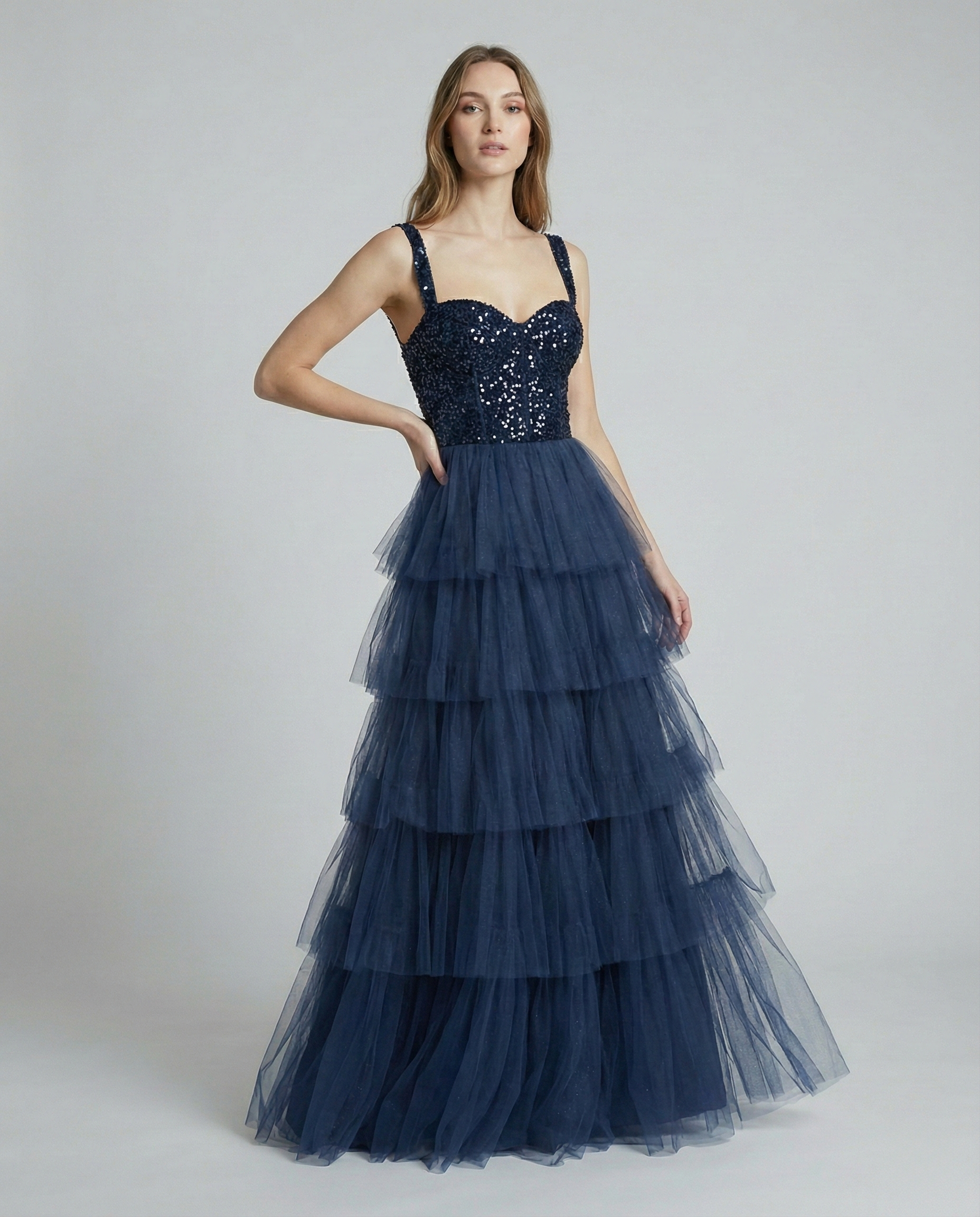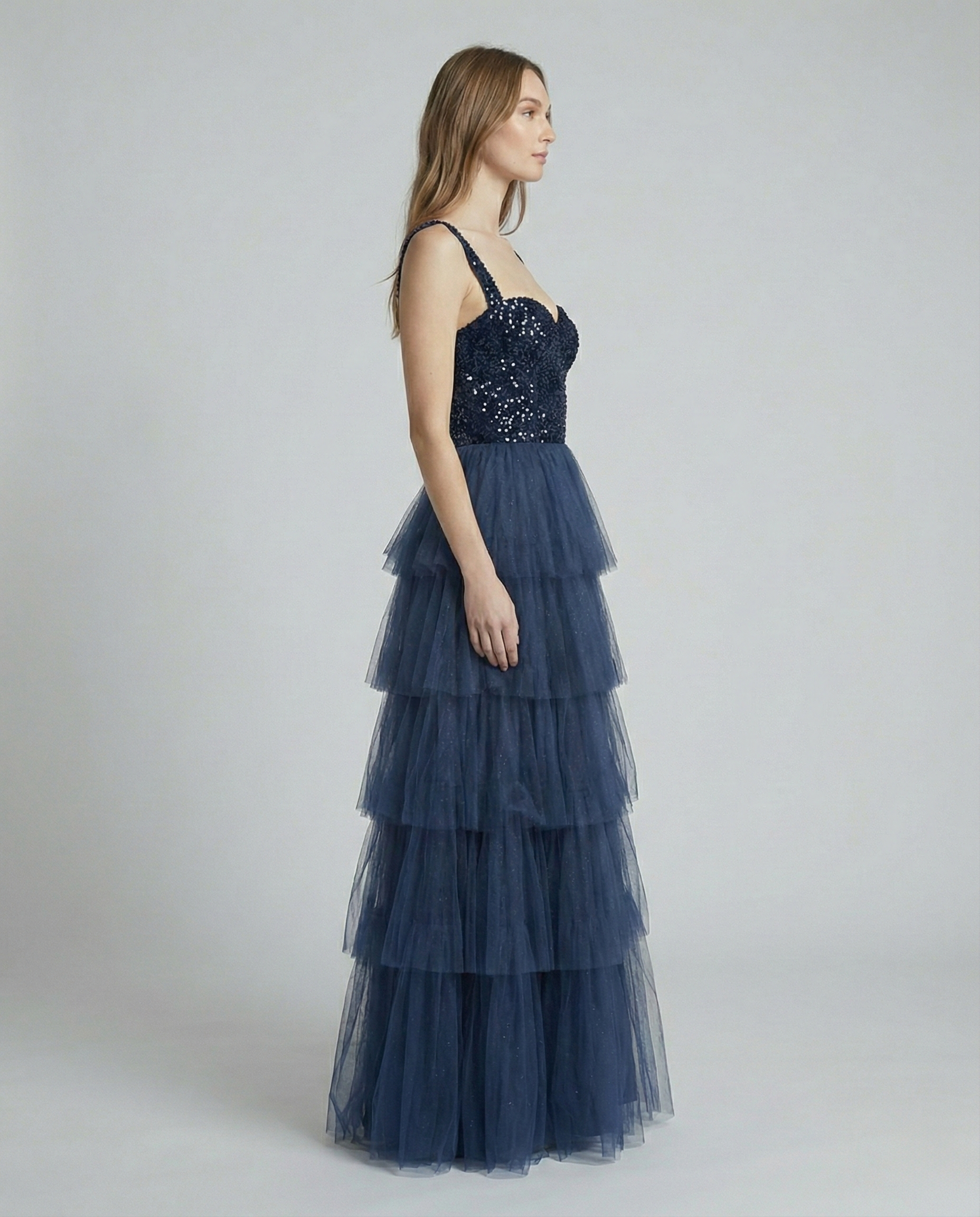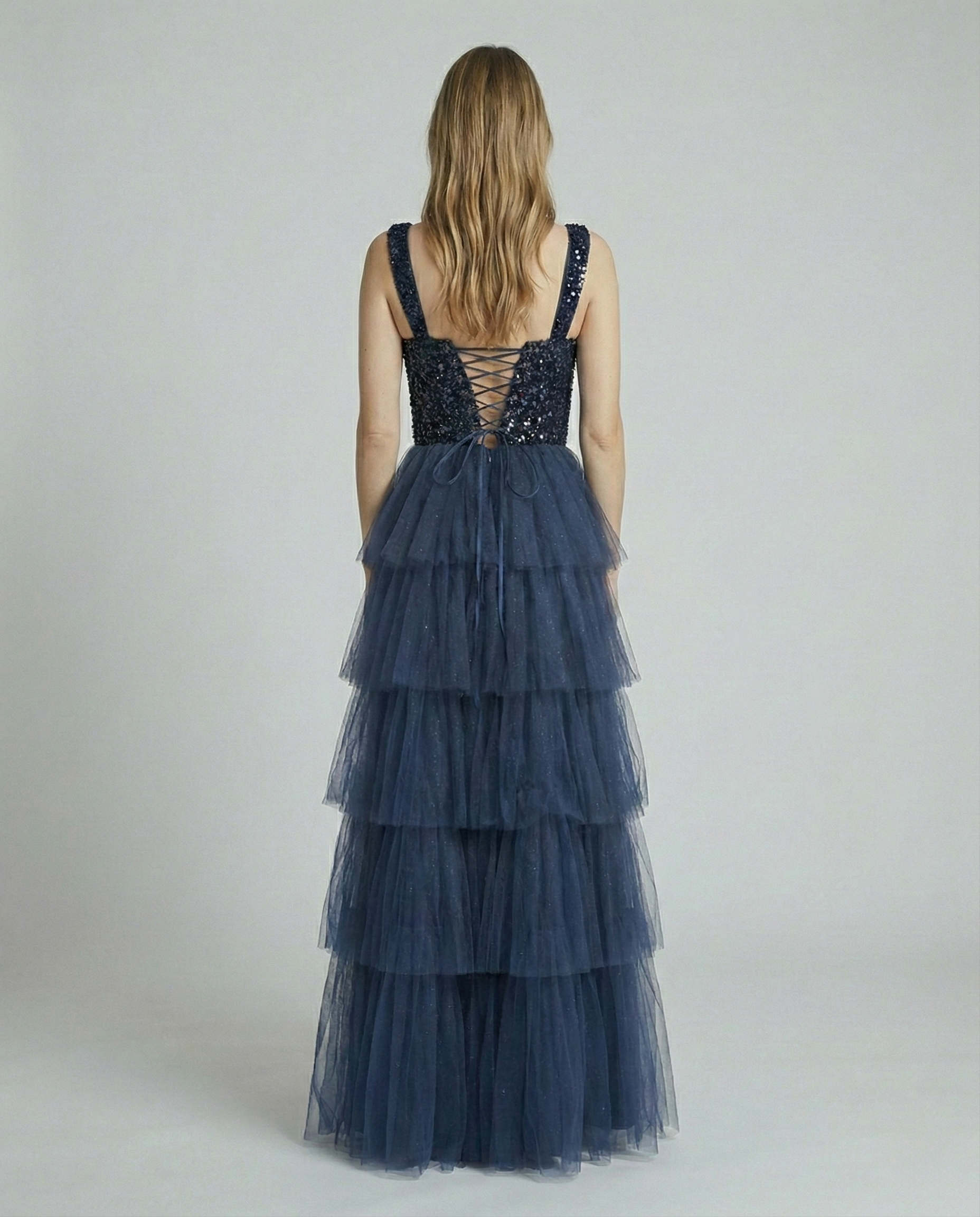 Gorset w cekiny subtelnie połyskuje, przyciągając spojrzenia i nadając kreacji wieczorowego blasku.