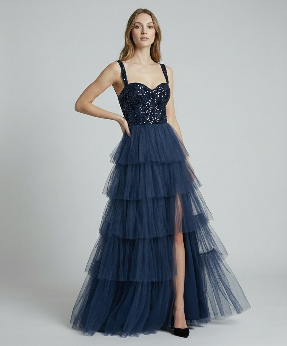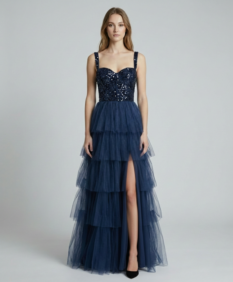 Sukienka Mija Granatowa to efektowna sukienka maxi z rozporkiem z przodu i cekinowym gorsetem. Model na ramiączkach, wiązany z tyłu.
