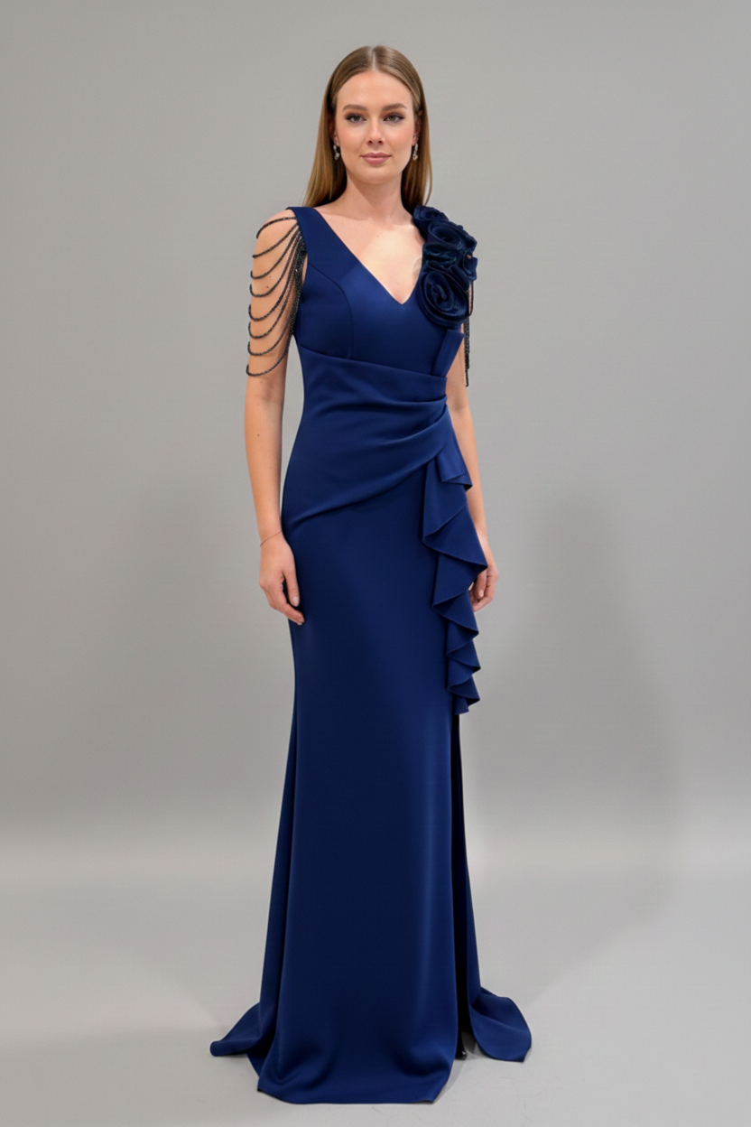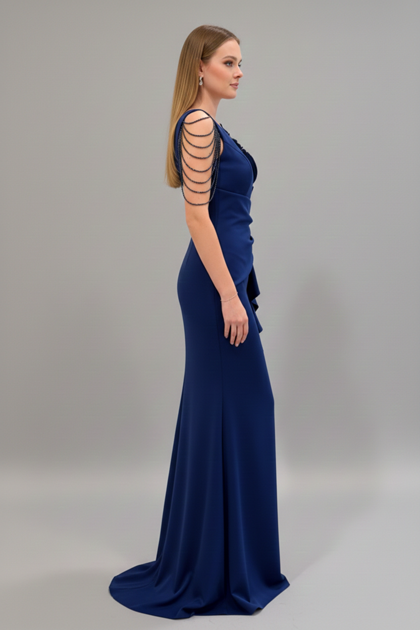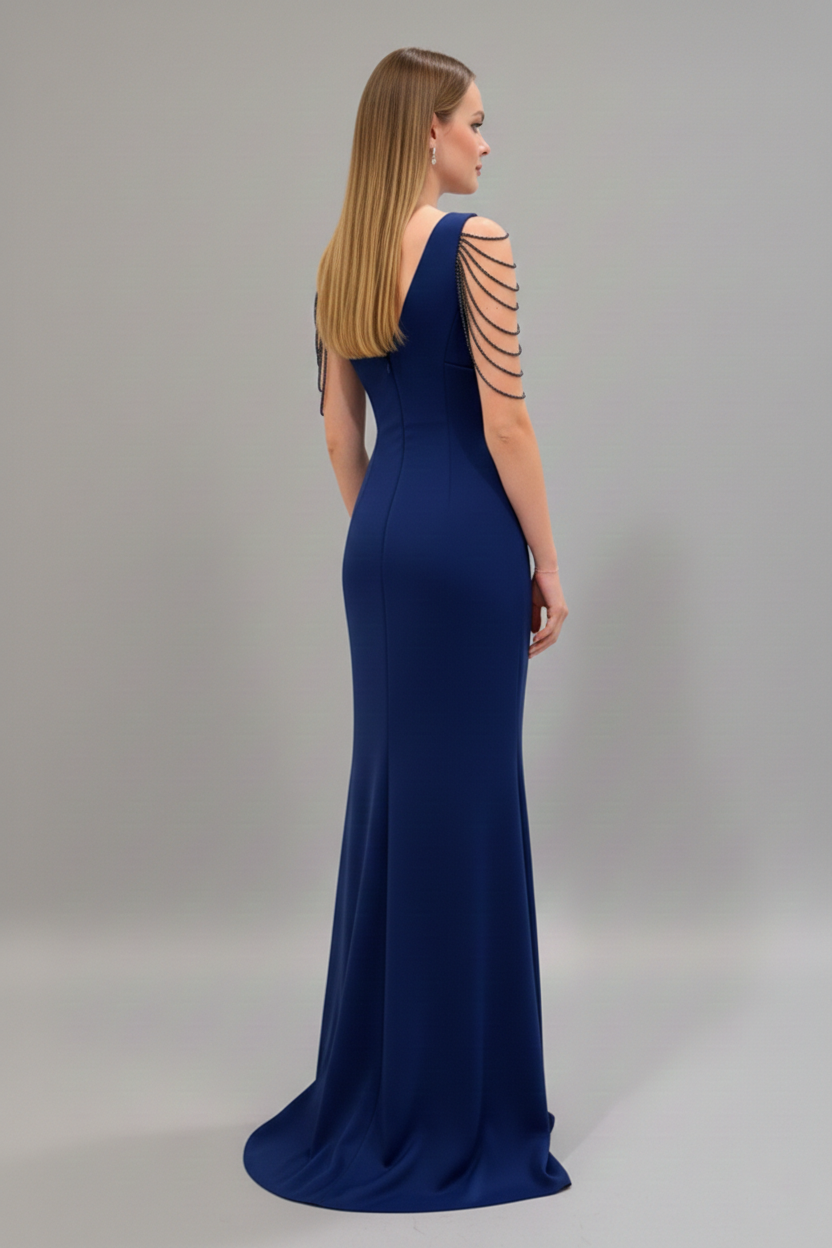 Sukienka Monia Granatowa to elegancka, dopasowana kreacja maxi z efektownymi aplikacjami. Idealna na wesele, studniówkę i wyjątkowe okazje.