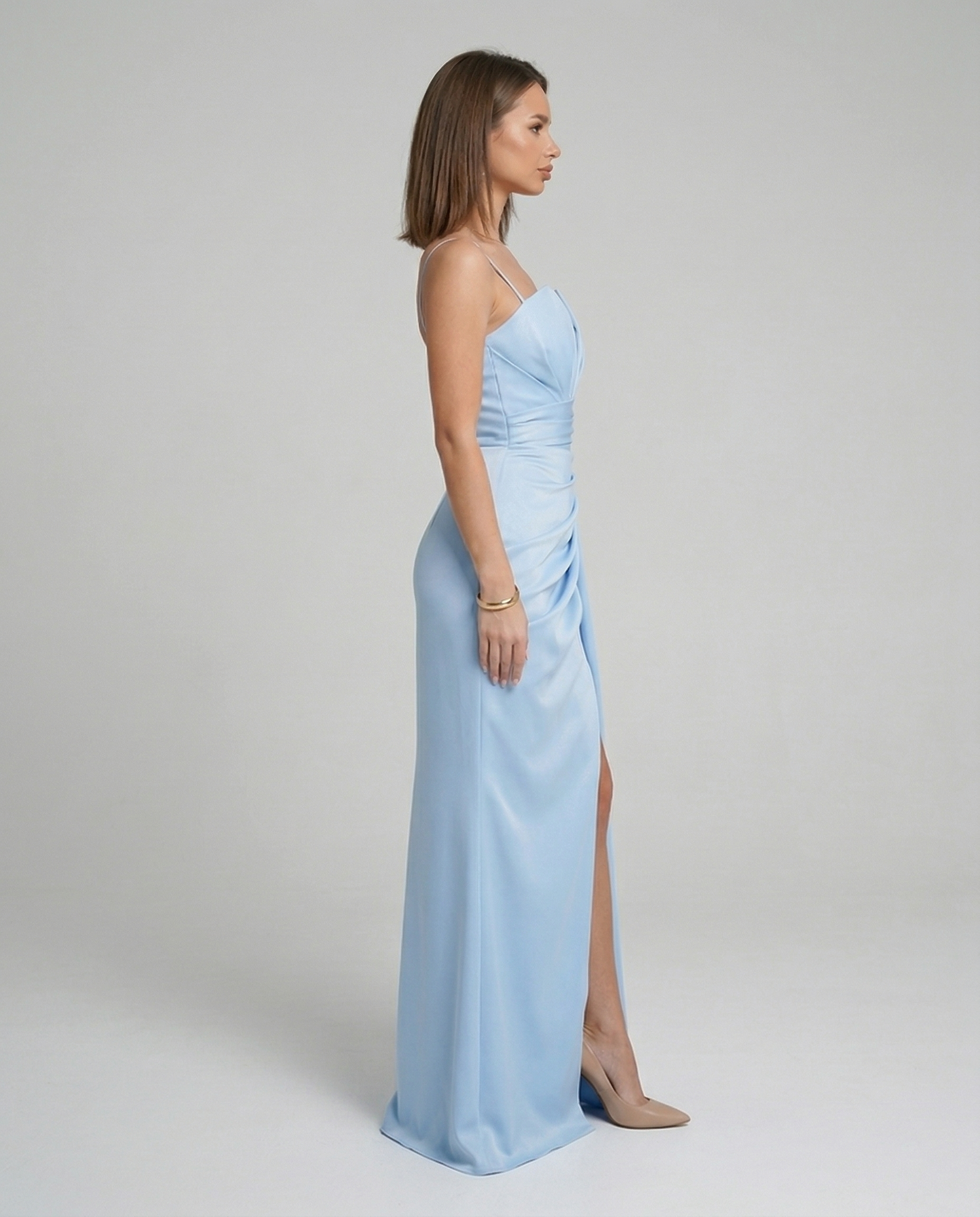 Dół sukienki podkreśla kobiecość. Długi, lekki materiał pięknie układa się w ruchu, a rozcięcie z przodu eksponuje nogę i dodaje zmysłowości.