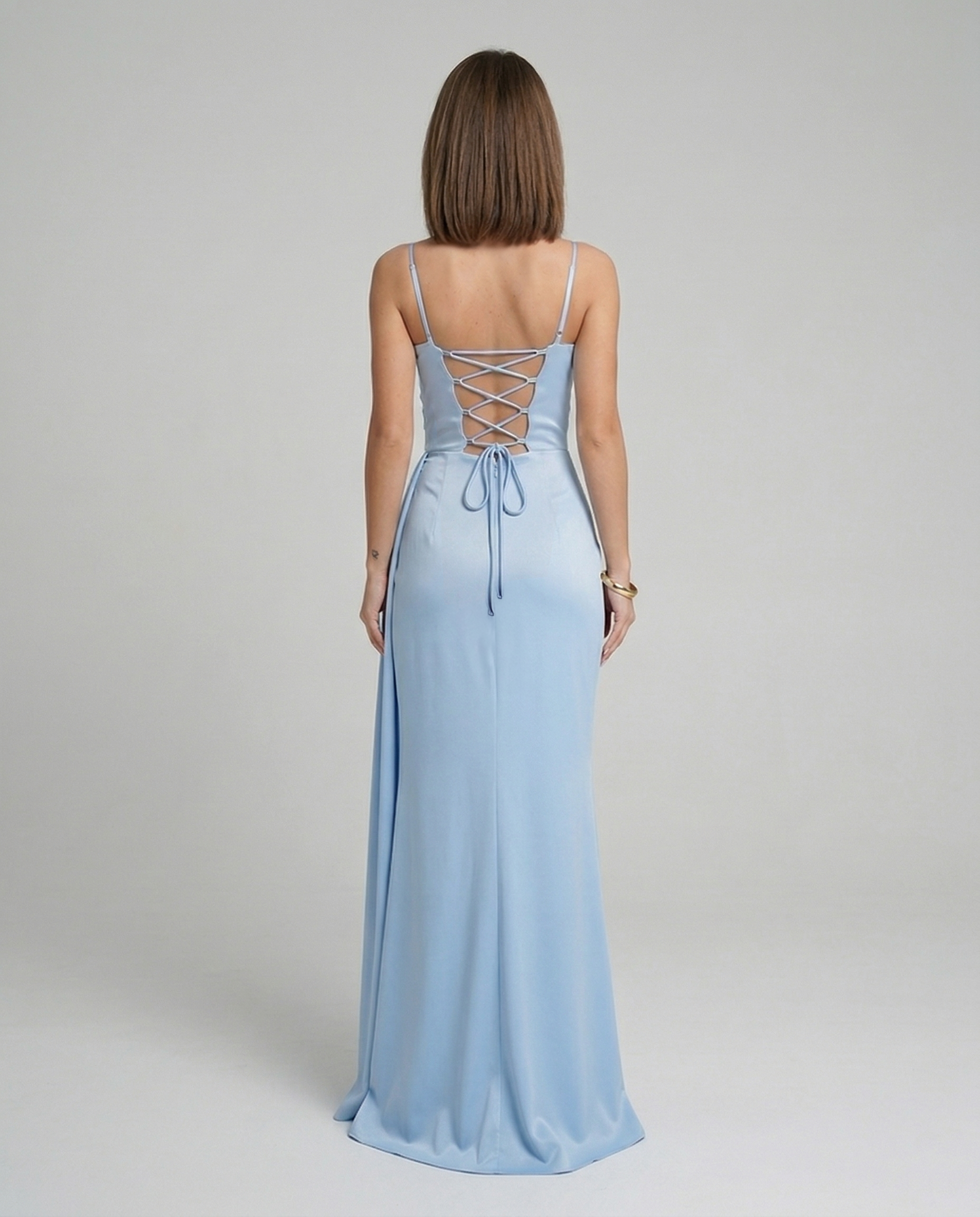 Tył przyciąga uwagę efektownym wiązaniem na plecach. Rozwiązanie to nie tylko wygląda stylowo, ale także pomaga idealnie dopasować sukienkę do figury. Zamek zapewnia wygodę zakładania i stabilność noszenia.